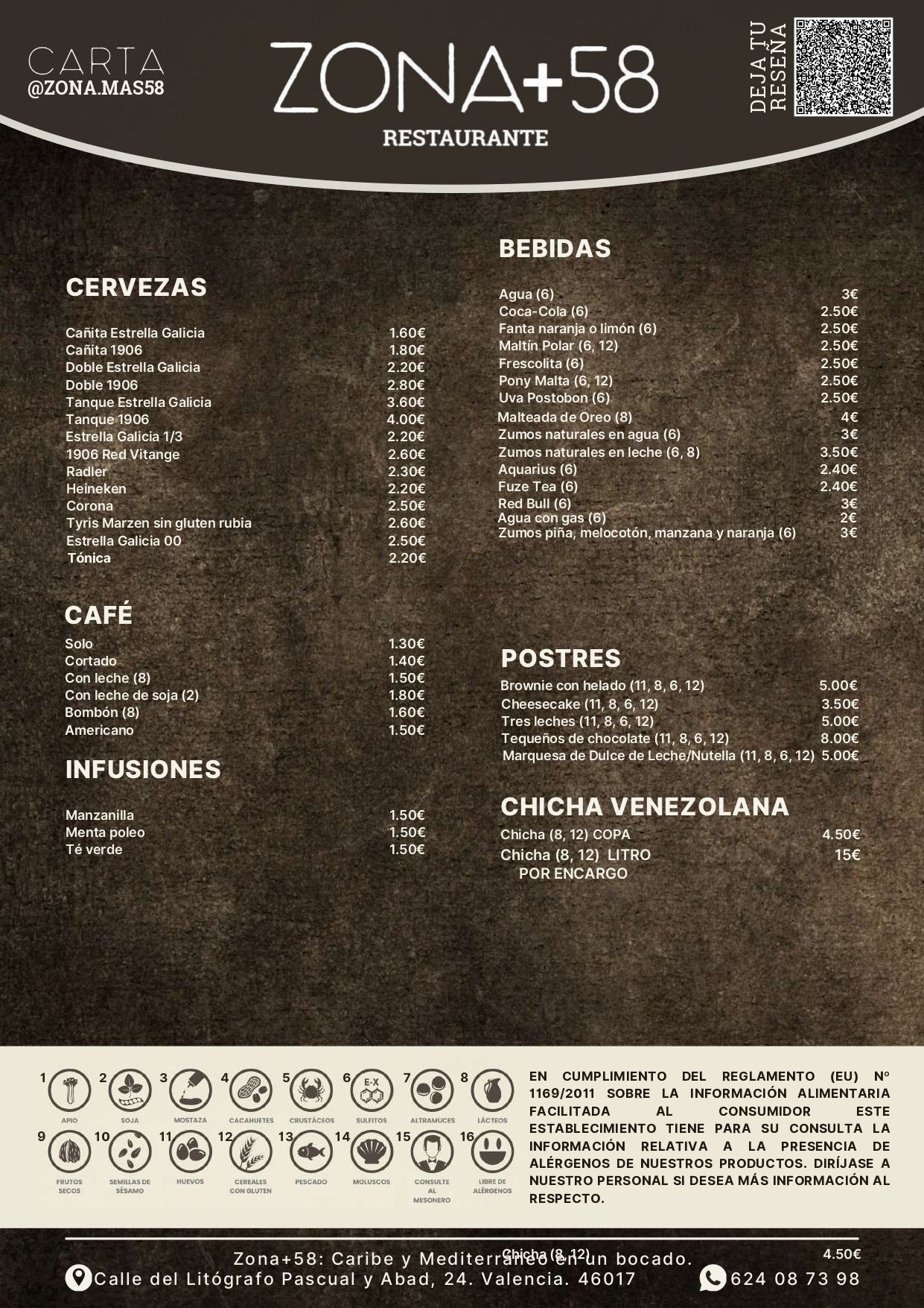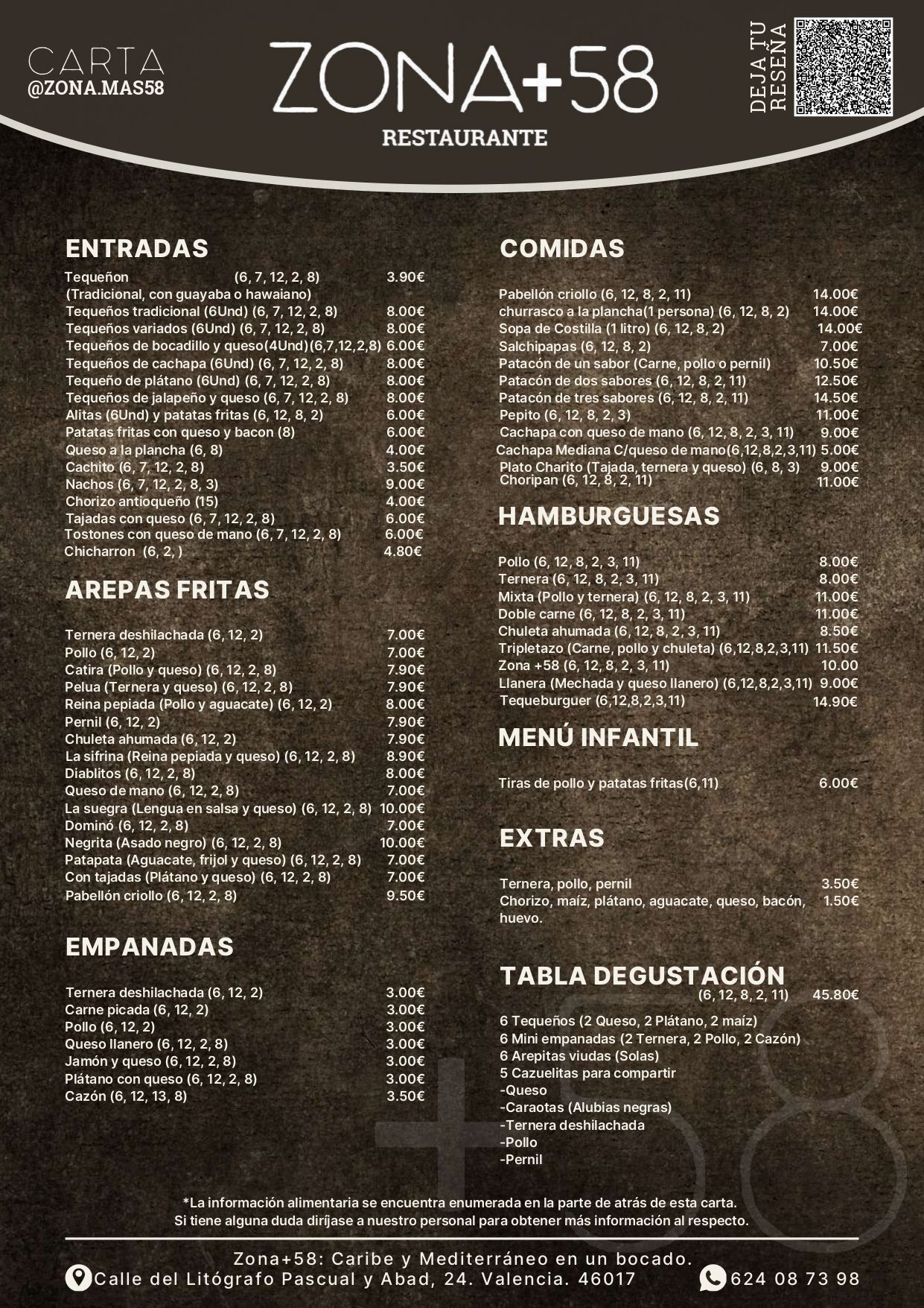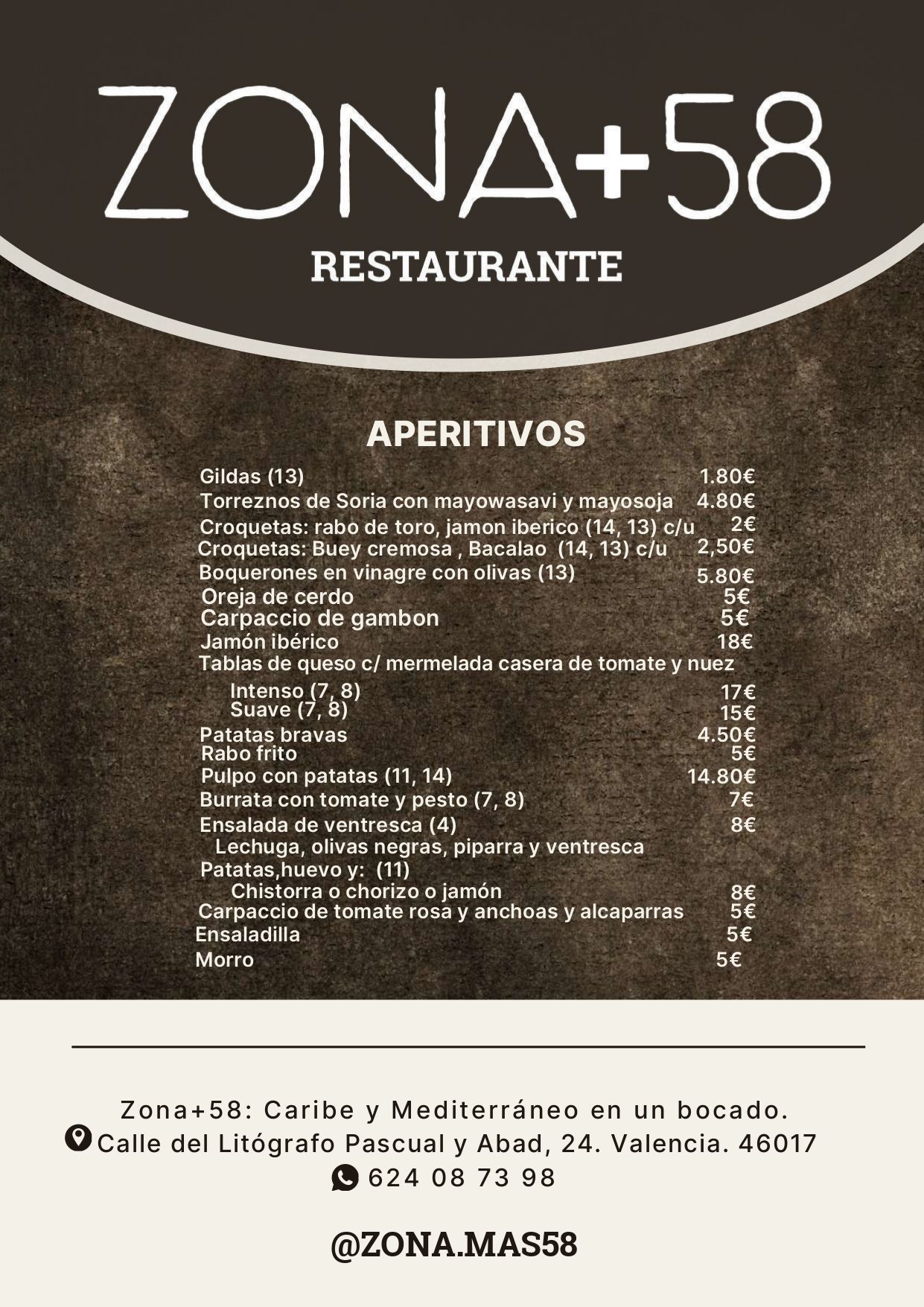 En ZONA +58 cuidamos cada detalle para ofrecerte una carta completa y equilibrada, con opciones vegetarianas, sin gluten y menús especiales para los más pequeños.
